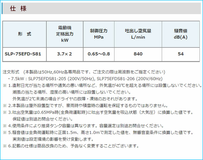 ご希望条件がオイルフリー且つ設置場所が屋内ではなく屋外であり、スペックは10馬力(7.5kw)程度とのことでした。
